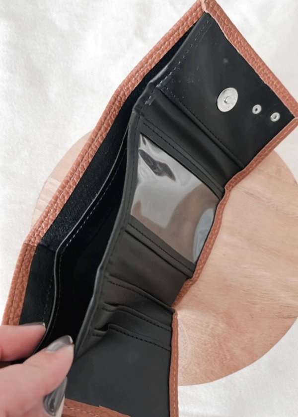 Billetera de simil cuero color suela con textura suave. Clásica, práctica y con estilo. Tiene múltiples compartimentos para tarjetas, billetes y un espacio transparente para documentos. El detalle metálico de perrito le da el toque distintivo. Es perfecta para cuando tenes que salir con lo mínimo e indispensable.