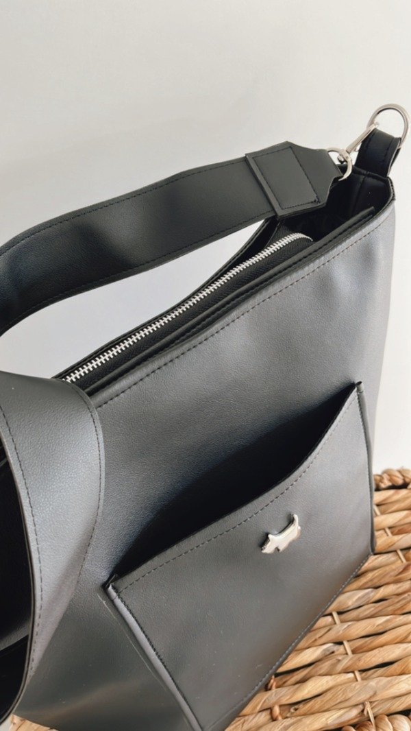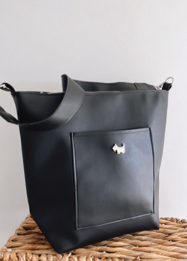 Bolso tote confeccionado en simil cuero negro, forrado en su interior. Un básico elegante y funcional. Cuenta con amplio espacio interior y bolsillo frontal con detalle metálico de perrito. Ideal para llevar todo lo que necesitas para la oficina, la facu o para viajar.